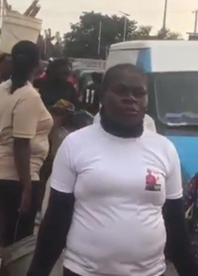 group of people on a street in what appears to be an urban or semi-urban setting. Several individuals are carrying buckets, and there's a blue and white Ford Transit van parked nearby. The people in the video are wearing different types of clothing, including t-shirts with writing on them. The environment appears to be a busy street, and there's a green flag flying in the distance.