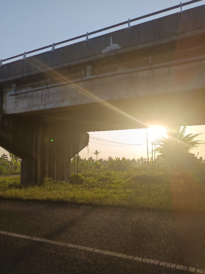 The scene is located in Sabandar, Indonesia. The foreground displays an asphalt road with a faded white dashed line. Above the road, a concrete overpass spans the view, its underside revealing several grey pipes affixed horizontally. Beneath the overpass, a patch of unkempt green vegetation transitions into a field dense with tropical foliage, including apparent banana plants and palm trees, extending towards the horizon. Utility poles carrying power lines are visible traversing the vegetated area. The sun is positioned low in the sky on the right, casting significant lens flare across the image and backlighting the scene. The sky above the overpass is clear light blue. No individuals or vehicles are present.