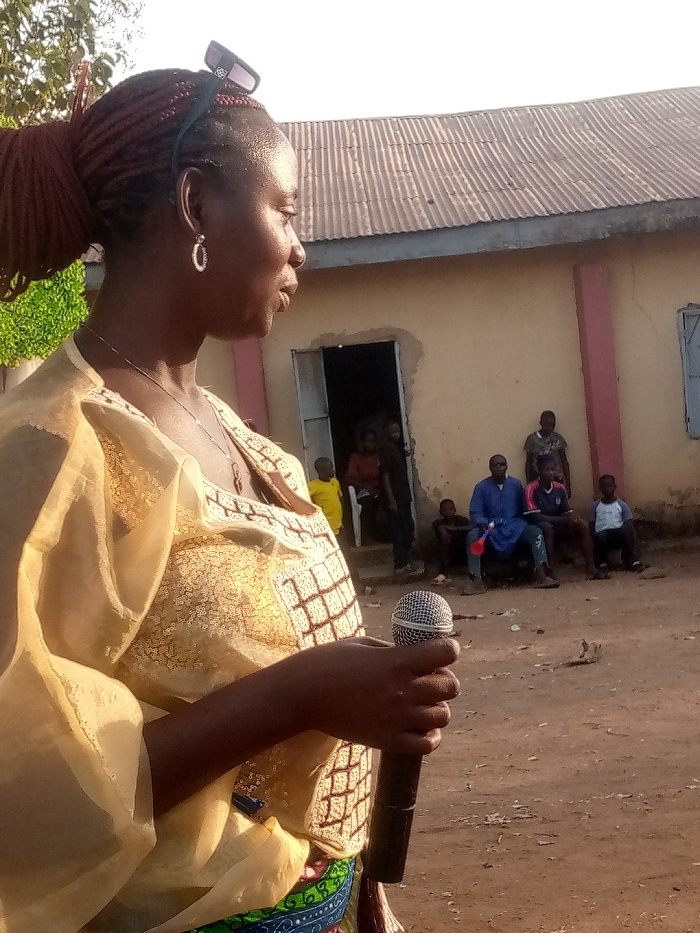 A woman in a gold top and green patterned bottom holds a microphone. She is in profile, looking to the right. Sunglasses are on top of her head. Behind her, a group of people sits on the ground in front of a building with a metal roof. The building has a doorway and a window with a pink border. The ground is dirt, and there are trees in the background.