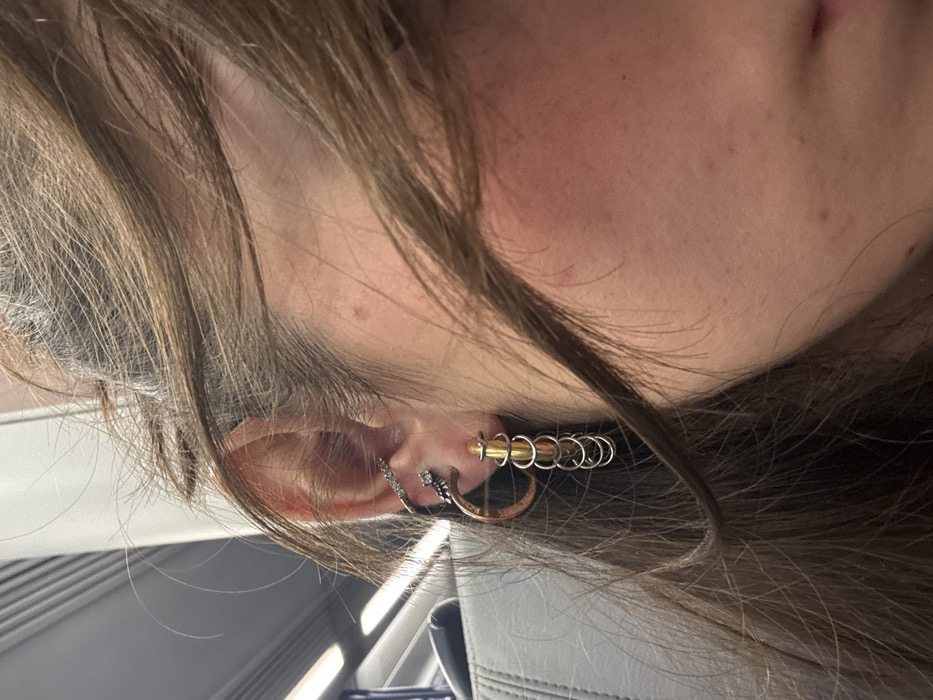 A close-up, sideways view of a person's ear reveals multiple piercings adorned with various jewelry
