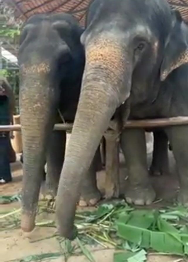 Two Asian elephants stand under a thatched roof, leaning against a wooden fence. The elephants are surrounded by green leaves and grass, which they are eating. A person is partially visible in the background.