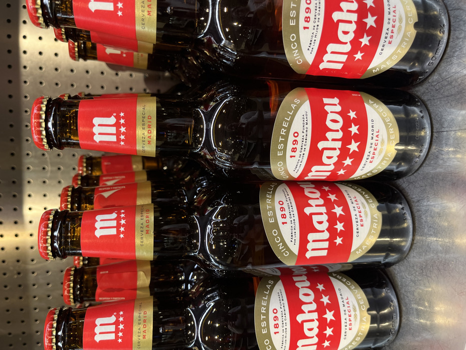 A shelf in a store in Telde, Spain, at the coordinates 27.938, -15.389, is stocked with a variety of bottles of Mahou beer, a Spanish brand. The bottles are arranged in a row, with their labels facing forward. The labels are red and gold, with the Mahou logo in red and the words "Cinco Estrellas" in gold. The bottles are all full and have red caps. The shelf is made of metal with a perforated surface. The store appears well-lit and tidy. The bottles are arranged in a row, with their labels facing forward. The labels are red and gold, with the Mahou logo in red and the words "Cinco Estrellas" in gold. The bottles are all full and have red caps. The shelf is made of metal with a perforated surface. The store appears well-lit and tidy.