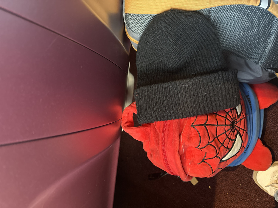 This image depicts personal items stowed on the floor beneath a seat within a passenger vehicle, consistent with an aircraft or train, located in Hoofddorp, Netherlands. The upper section of the frame features the curved, matte purple-red underside of a seat, exhibiting two distinct vertical panel seams. The floor below is dark-colored and appears to be carpeted. On the left side, a red, plush backpack designed as Spider-Man's face is visible, featuring white eyes with black outlines and a black web pattern. A blue item is partially discernible directly beneath this backpack. A light-colored shoe is partially visible in the lower-left corner. Centrally positioned is a folded black knitted beanie hat, resting partially on the Spider-Man backpack. To the right, a portion of a grey and orange backpack is present, with the grey section displaying a mesh-like texture. No individuals are depicted within the frame; the arrangement of items suggests human occupation of the seating area.