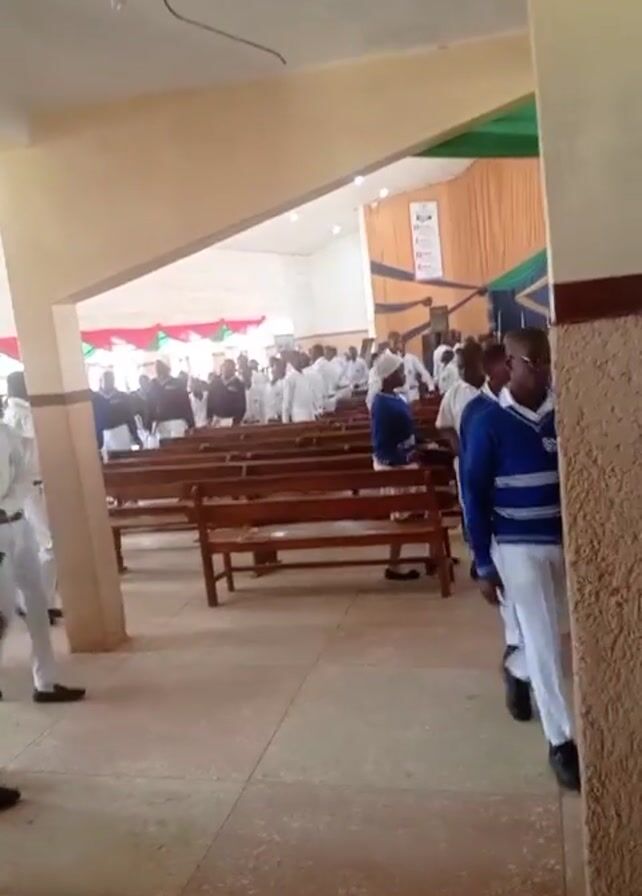 group of people inside what appears to be a church or large hall. Most of the individuals are wearing white uniforms with some wearing blue sweaters over their white shirts. They are standing and moving around. The interior of the building has rows of wooden pews. There is a stage-like area at the far end with decorations. The camera appears to be held by someone who is walking past the group. The lighting in the room is moderately bright.