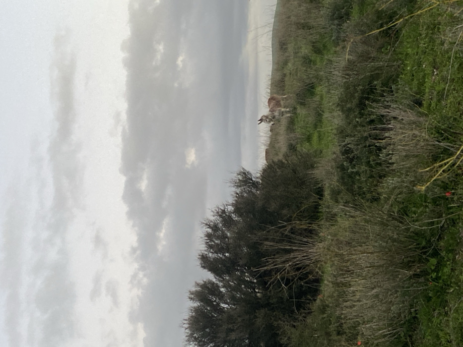 An overcast sky dominates the landscape above a hillside. The slope is covered in green grass and dry brush. Two light brown donkeys stand on the hill. A large bush is in the midground, with smaller shrubs around it. The scene depicts a rural or wild area.