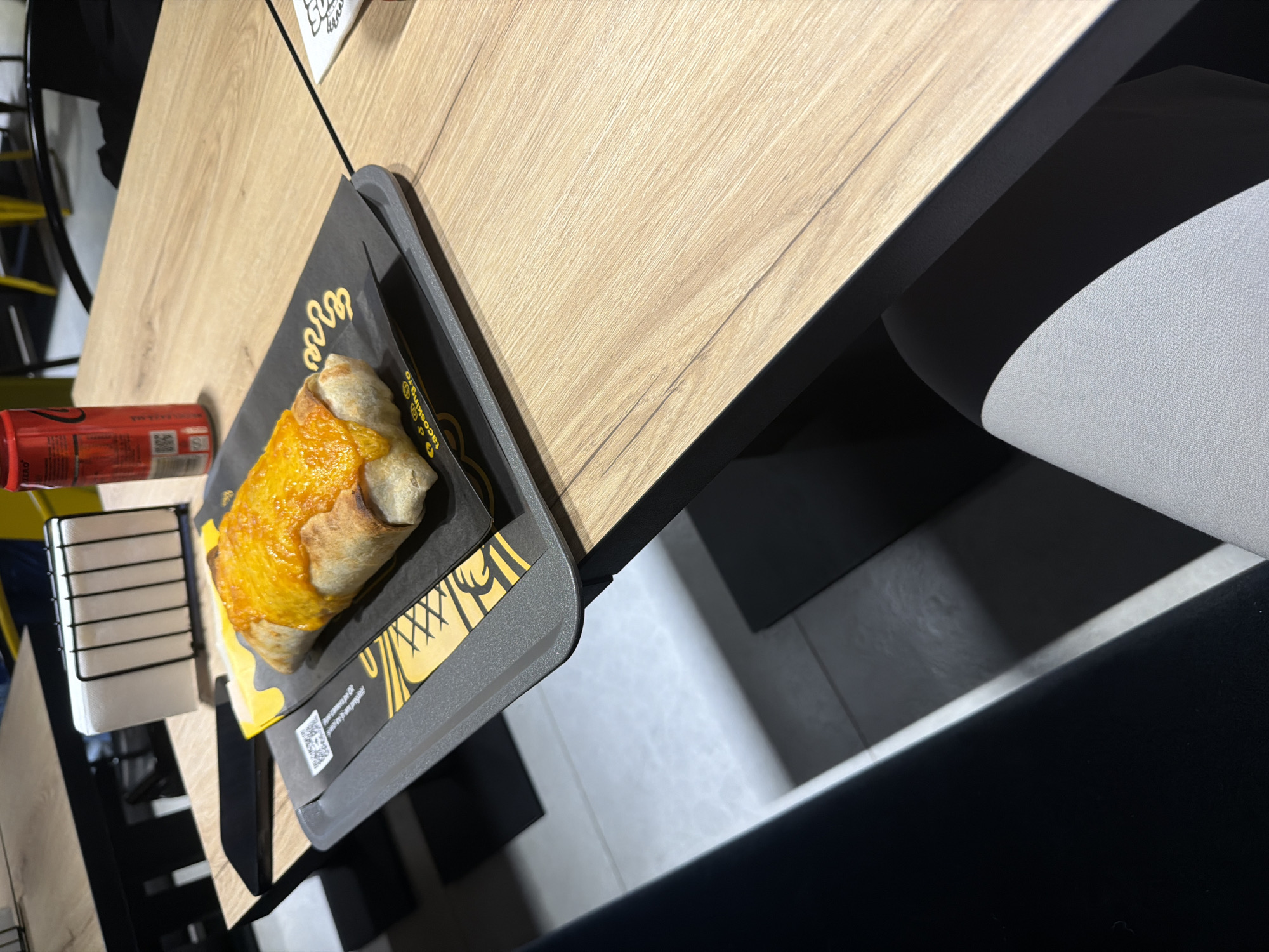 The image depicts an indoor scene within a Tacos King restaurant, located in Constanța, Romania. A light wood-grained laminate table is shown from a first-person, seated perspective. On the table, a dark grey plastic tray holds a large, golden-brown wrap, consistent with a burrito, covered in a bright orange melted cheese or sauce. This food item rests on black paper printed with yellow graphical elements and the website "tacosking.ro". To the upper right of the tray, a red Coca-Cola Zero aluminum can is positioned. To the upper left, a black wire napkin holder contains white paper napkins, situated next to a black smartphone lying flat on the table. The lower right foreground shows a grey fabric-covered seat, belonging to the vantage point. The background reveals additional tables and chairs, some with yellow accents, indicative of a casual dining establishment. The floor visible beneath the table is a light-colored tile. No individuals are explicitly visible.