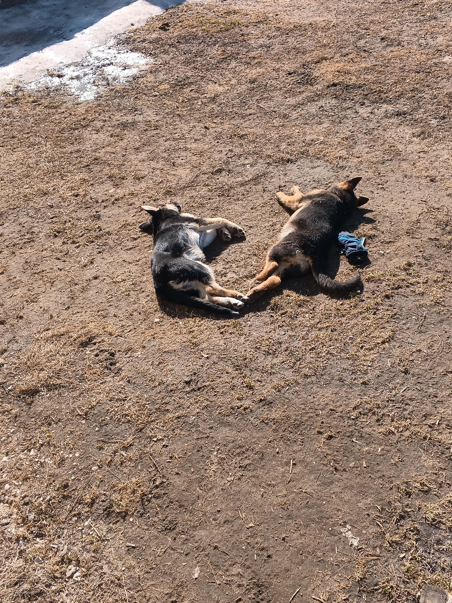 The image displays an outdoor scene in Andreyevo, Russia, viewed from a high angle under bright sunlight. Two canines, identified as young dogs or puppies with black, tan, and brown fur, are lying on the ground. The dog on the left rests on its left side, facing towards the upper left portion of the frame. The dog on the right rests on its right side, facing towards the upper right, with a crumpled blue textile object located near its hindquarters. Both animals are in a state of repose. The ground consists primarily of dry, light brown soil mixed with sparse patches of desiccated grass and small stones. In the upper left quadrant, a section of white, reflective material consistent with melting snow or ice is visible on the ground. No human subjects are present.