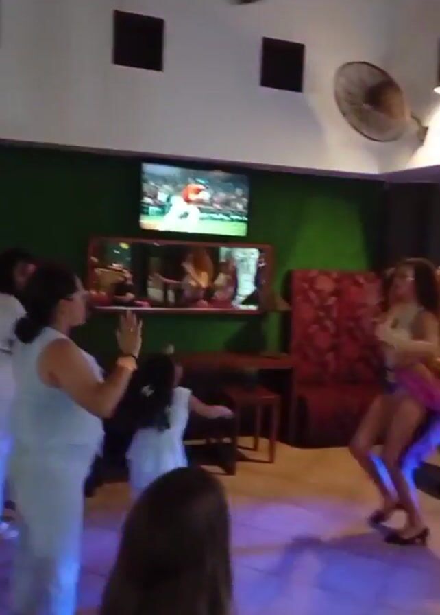 brightly lit room with people dancing. Two women wearing high heels and pink sequined costumes are dancing on a white tile floor that’s illuminated by red and blue lights. A woman in a white jumpsuit and a young girl in a blue dress are also on the dance floor. The room has three square black lights, a TV screen showing a soccer game, and a brown ceiling fan.
