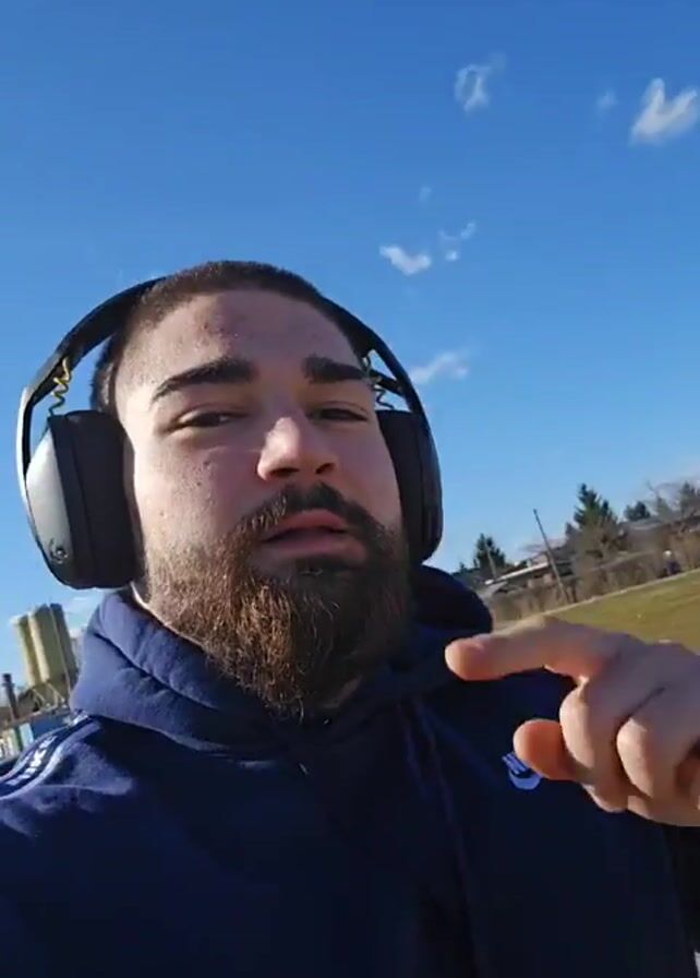 A man with a beard and headphones, wearing a blue hoodie, is walking outside. The sky is blue with scattered clouds. He holds his finger up and then makes a fist. He appears to be speaking to the camera. The background consists of a road, grass, and buildings in the distance.