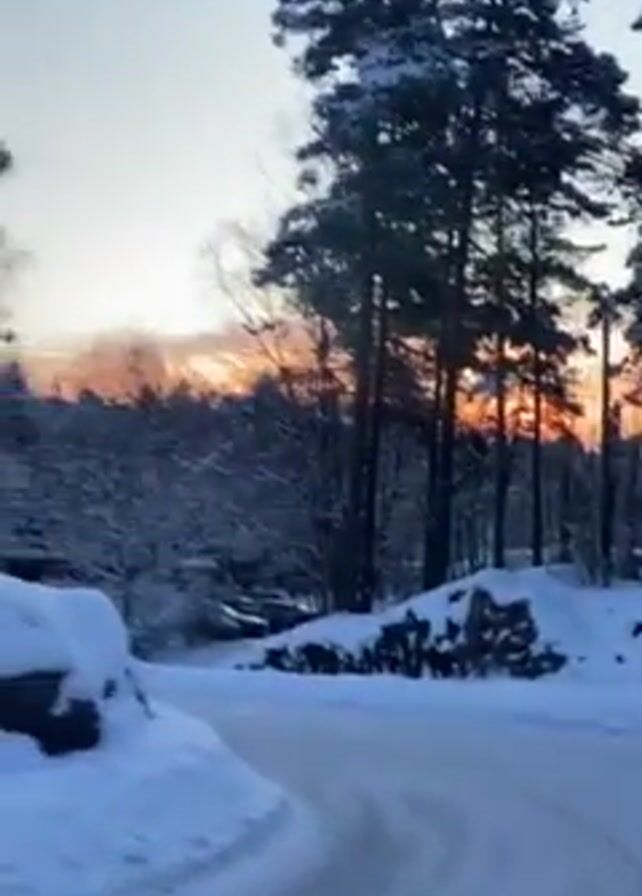 snow-covered road winding through a forest at sunset. Tall pine trees covered in snow line both sides of the road, and the sky is a gradient of blue and orange where the sun is setting. There is no visible traffic or people on the road.