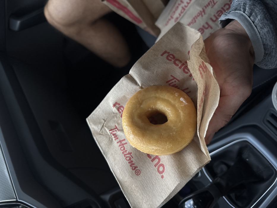 A glazed donut rests on a Tim Hortons napkin