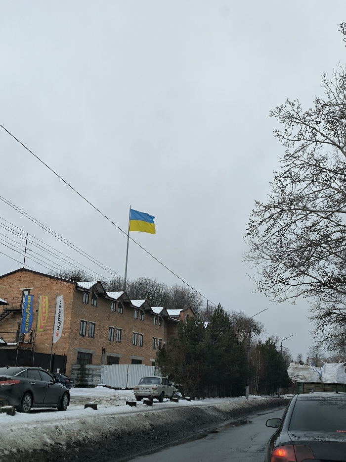 An outdoor, slightly elevated view depicts a street scene on an overcast day in Vinnytsia, Ukraine, specifically at or near 2A Maksyma Shymka Street. The foreground features the rear of a dark sedan, likely an Audi, partially obscuring the lower right. A two-lane road, wet with slush and snow patches, extends into the midground. To the left, a dark sedan, possibly a Kia K5, is parked on a snow-covered shoulder. Further down, a light-colored, older model sedan (resembling a Lada) is also parked on the left. The dominant feature in the midground is a large Ukrainian flag, blue over yellow, waving from a tall metal flagpole centered above a multi-story brick building. This building, with a red brick facade and a series of snow-dusted, dark-roofed dormer windows, features vertical banners on its left side displaying "GOODYEAR" and "HANKOOK" logos, indicating an automotive service center or tire shop. Construction barriers or stored materials are visible in front of the building's lower level. To the right of the building, a line of evergreen trees and bare deciduous trees borders the road. The far right background shows a vehicle, possibly a truck, laden with large white sacks. Utility lines span horizontally across the upper portion of the image. The sky is uniformly grey and overcast. Snow covers roofs, ground, and tree branches, indicating winter or late autumn conditions. No individuals are visibly present.