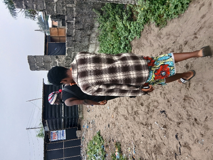 Two individuals traverse a sandy terrain littered with debris, adjacent to a building. One person wears a checkered, brown and white jacket paired with a floral skirt and sandals. The other wears a black shirt and a colorful head covering. The background features a dilapidated structure with a black facade, overgrown with vegetation and the remains of old walls. The sky is overcast, lending to a muted color palette in the scene.