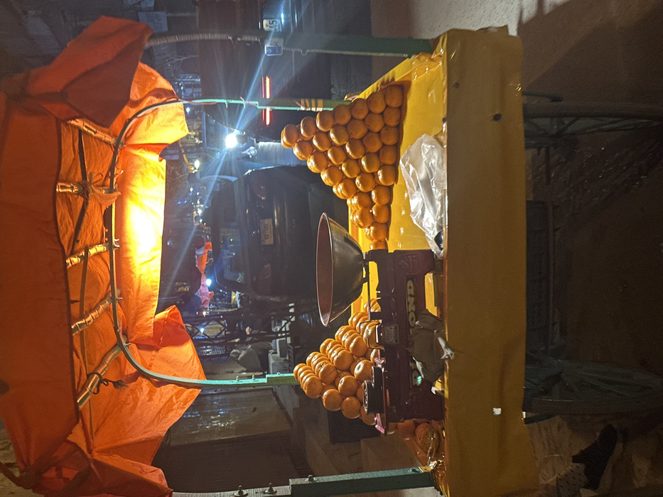 This image depicts a mobile fruit vendor's stall at night in Quetta City Tehsil, Pakistan