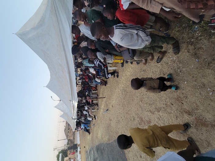 An outdoor event is in progress under a white tent, with people seated in rows. Two children are lying on the ground in front of the seated audience. One is wearing a brown outfit with blue shoes, while the other is wearing a yellow outfit. The ground is covered with dry grass. The event seems well-attended, with a mix of adults and children. A few buildings are visible in the background.