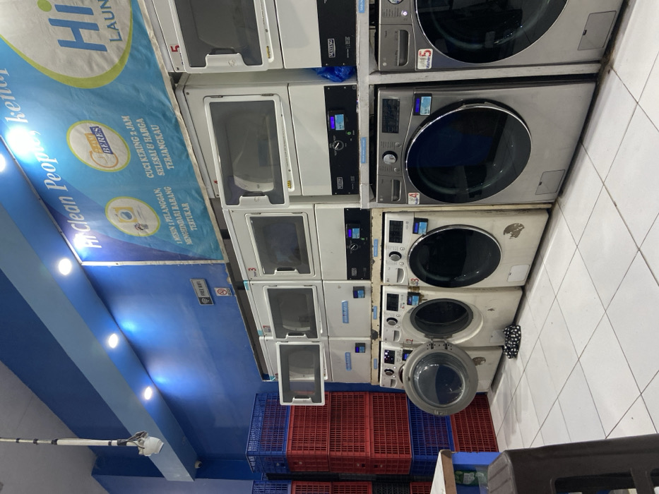 This image depicts the interior of a self-service laundromat located in Balonggabus, Indonesia