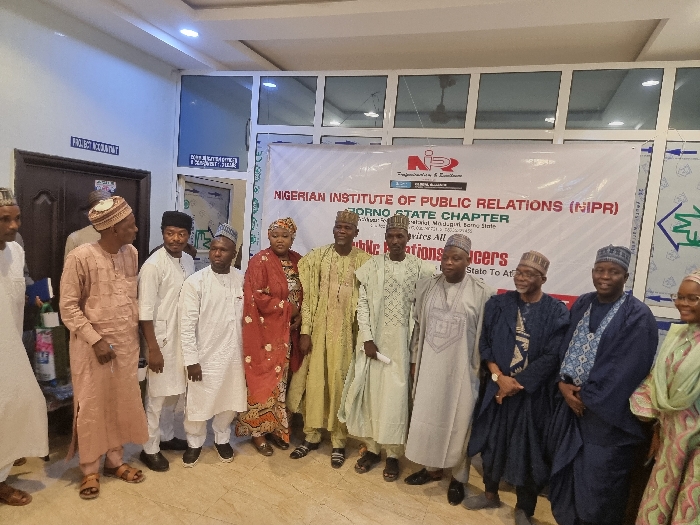 group of 10 people standing in front of a banner that reads "Nigerian Institute of Public Relations (NIPR) Borno State Chapter"