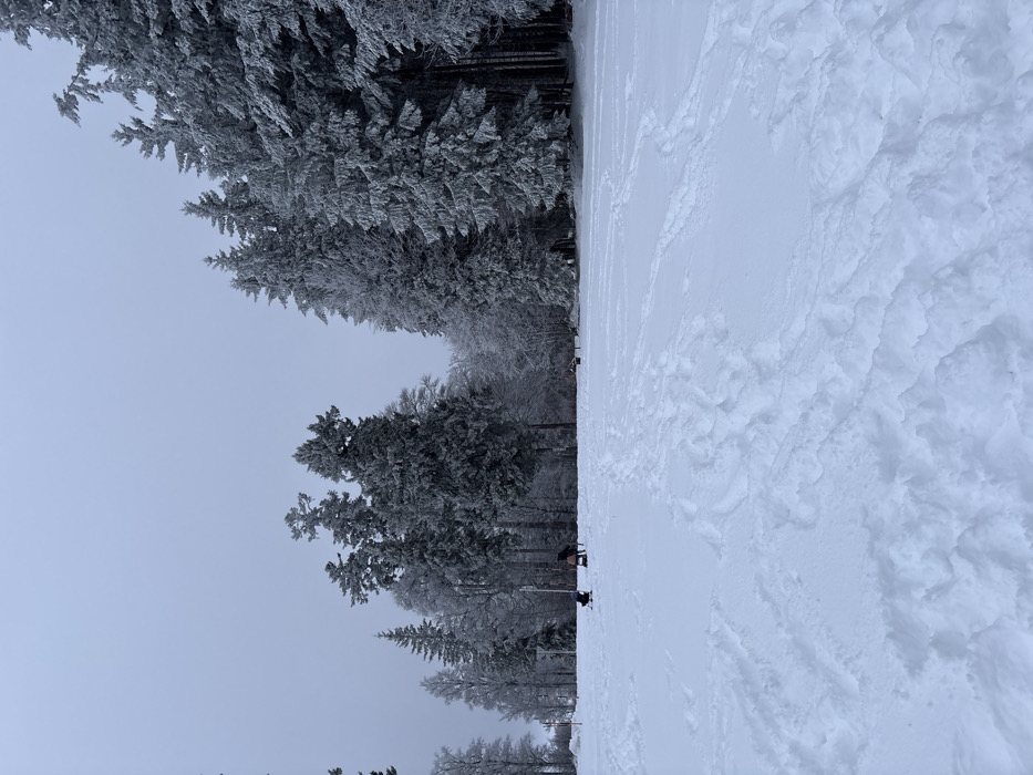 This image depicts a snow-covered winter landscape in Le Hohwald, France. The scene is dominated by a wide, snow-covered field in the foreground and middle ground, bordered by a dense forest of evergreen and some deciduous trees heavily laden with snow and frost, extending into the background and along the right side of the frame. The sky is uniformly overcast and light grey, suggesting a cold, hazy day. In the middle ground, slightly to the left of the center, two figures are present in the snow. The left figure, appearing smaller, is positioned low to the ground, possibly kneeling or sitting, dressed in dark attire, with a dark object resembling a small sled or ski equipment directly in front of them. To their right, a second, larger figure is observed bending forward or kneeling, also dressed in dark clothing, seemingly interacting with the ground or assisting the first figure. Further in the distance, near the left tree line, a smaller, darker object or third figure is faintly visible. Another very faint, dark, horizontal object or figure is discernible further to the right in the mid-ground, closer to the tree line. The snow-covered field exhibits numerous tracks and depressions, particularly in the foreground and stretching towards the figures, indicating prior activity. A slender, white vertical pole with a horizontal arm, possibly a signpost or marker, is present in the mid-ground behind the two main figures. Closer to the right edge of the forest in the mid-ground, a dark, horizontal structure, resembling a picnic table or bench, is partially visible.