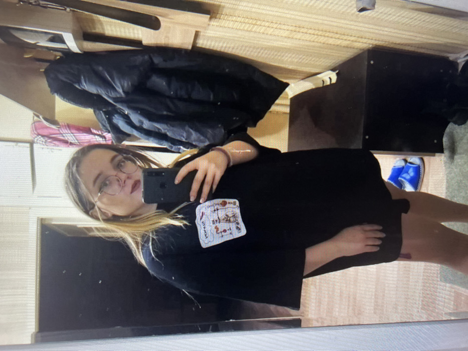 A young woman with blonde hair and glasses takes a selfie in a mirror. She wears a black t-shirt with a patch, holding a smartphone. Behind her are coats on a rack and a dark cabinet. Blue shoes are visible near the cabinet, positioned on a light-colored floor with a striped pattern. The image has been rotated slightly to the left.