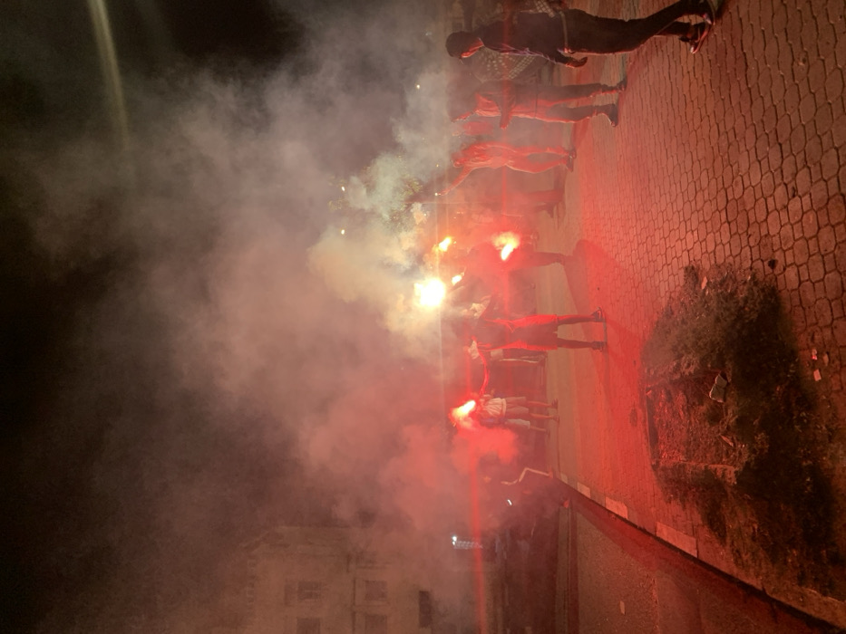 The image displays a nighttime urban scene in Casablanca, Morocco, characterized by the activation of multiple pyrotechnic flares
