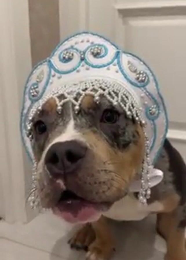 A short, eye-level shot shows a multicolored bulldog-like dog wearing a light blue and white headdress decorated with imitation jewels