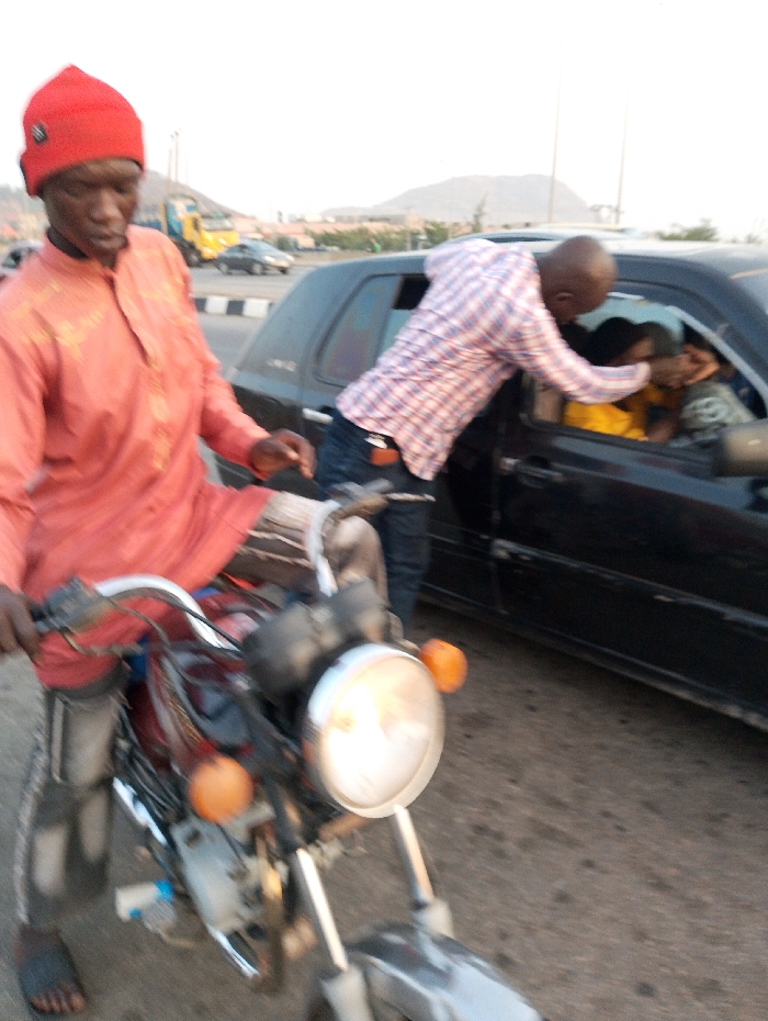 A man wearing a red hat and coral-colored shirt sits on a motorcycle with a bright headlight. Another man in a plaid shirt leans into the open window of a black car where people are seated inside. The scene takes place on a road with a truck and buildings visible in the background. The image is slightly blurred, giving a sense of motion.