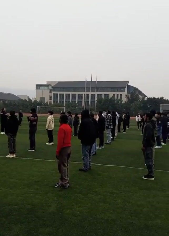A large group of people stand in lines on a green turf field. They are facing away from the camera. A multi-story building stands in the background. A few flagpoles are in front of the building. The sky is overcast. There are some small hills in the distance. In the background to the left, there is a stadium with blue and yellow seating.