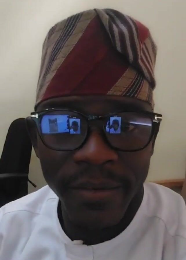 A man is talking to the camera. He is wearing a white shirt, black glasses, and a hat made up of red, brown, and beige stripes. He raises his finger and looks at the camera. In the reflection in his glasses, you can see his own image, as well as the reflection of a computer screen. Behind him, you can see a black microphone and a beige wall. He says "See this life? Live in peace with one another."