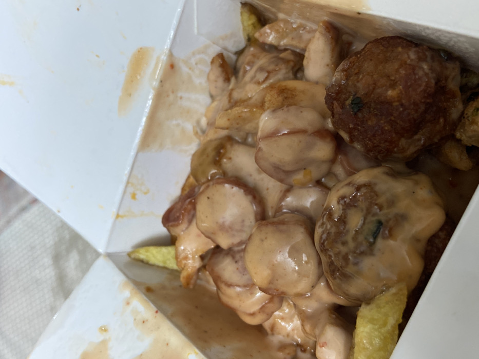 A close-up view depicts various food items served in an open, white, rectangular takeaway container. The container's interior walls are stained with light beige sauce. The food consists of multiple components heavily coated in a thick, creamy, light beige sauce. Visible items include sliced, circular pieces of what appear to be sausages with reddish-brown edges, irregularly shaped pieces of cooked poultry or meat, and at least two prominent dark brown, spherical items resembling meatballs or fritters, one of which shows a small green inclusion. Several elongated, golden-yellow pieces consistent with french fries or potato wedges are interspersed among the other ingredients. The background, visible above the container, is a blurred, light-colored, textured surface. No individuals or specific actions are depicted beyond the presentation of the meal. The scene is located in the city of Dhaka, Bangladesh.