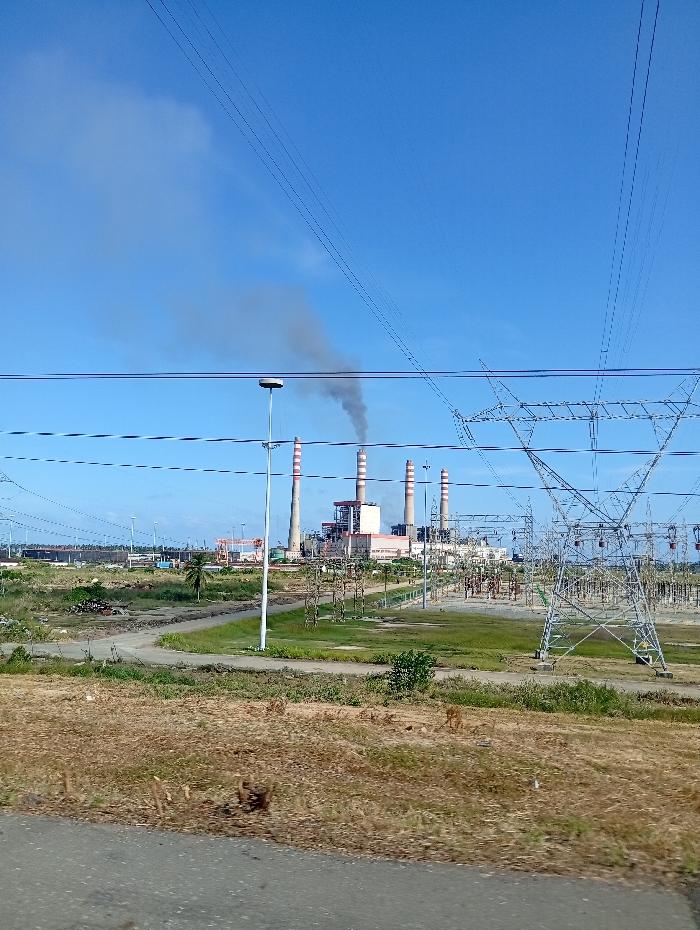 The scene depicts an industrial landscape located in Palma Sola, Venezuela, under a clear blue sky with minimal scattered cirrus clouds in the upper left quadrant. In the mid-ground to background, a large industrial power plant complex is visible, featuring at least four tall, cylindrical smokestacks with red and white striped sections near their tops. The second smokestack from the left is actively emitting a dense plume of dark grey to black smoke that ascends vertically before drifting slightly to the viewer's left. The plant's main structures are light-colored with red accents. In the mid-ground, a prominent lattice-steel electricity transmission tower stands on the right, supporting multiple overhead power lines that extend across the frame. Additional electrical substation equipment, including smaller towers, insulators, and transformers, is distributed behind and to the left of this main transmission tower. Several thick, dark overhead power lines are visible closer to the viewer, intersecting the upper and middle portions of the sky. A single tall, slender white pole with a round, grey light fixture at its apex is positioned slightly left of center in the mid-ground. The foreground consists primarily of dry, light-brown vegetation and unkempt ground, with a dark, paved surface visible at the very bottom. Winding dirt paths or roads traverse the mid-ground, leading towards the industrial facilities. Patches of greener grass are visible closer to the power plant complex, which is partially enclosed by a green fence. Far to the left background, additional industrial structures, possibly cranes or port equipment, are discernible near the horizon. No individuals are visible within the scene.