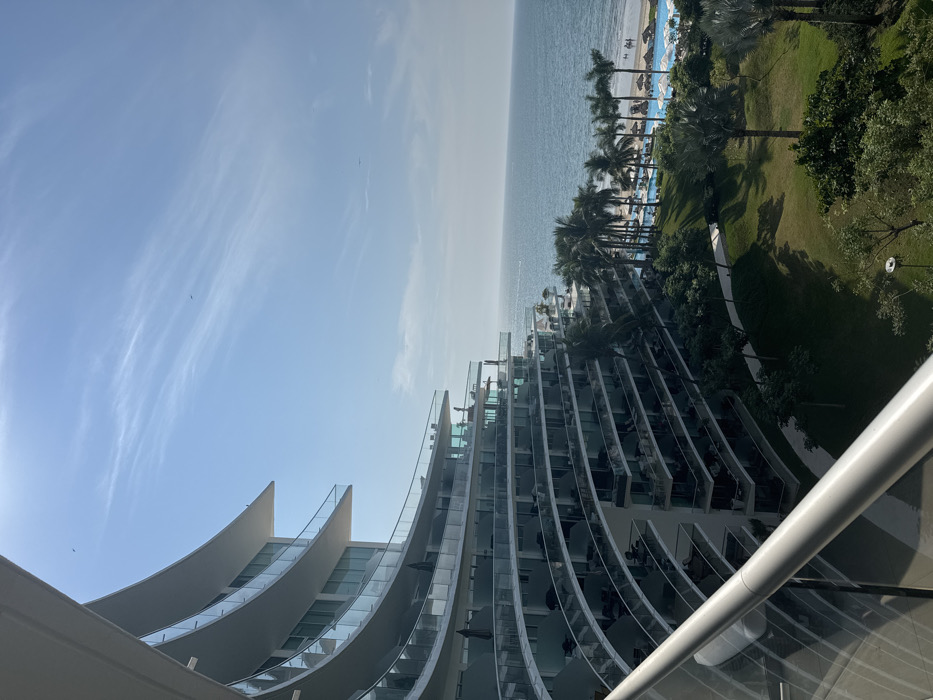 A high-angle shot shows a modern, curved building with glass-fronted balconies running along its facade. Beyond the building is a view of the ocean and a beach lined with palm trees. The beach transitions into a green lawn with more palm trees and some shade-providing trees. The sky is mostly clear with some wispy clouds. A portion of a railing is visible in the foreground.