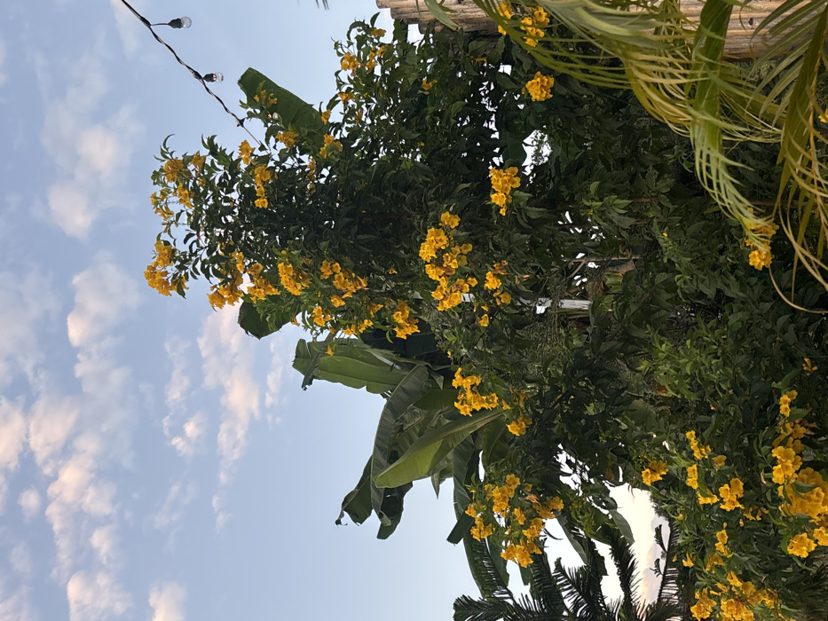 The image depicts an outdoor scene in Ban Mae Ping, Thailand, under a clear, light blue sky with scattered white clouds. The central and right portions of the frame are dominated by a tall, dense plant profusely covered in bright yellow, trumpet-shaped flowers. Large green banana leaves are visible behind and interwoven with the flowering plant. To the far left, dark green foliage consistent with a conifer-like tree is partially visible. A string of outdoor lights, featuring multiple clear bulbs, extends diagonally across the upper right quadrant of the image. In the lower right foreground, blurred green palm fronds are present next to a vertical wooden post or fence element. No individuals, specific actions, or interactions are depicted.