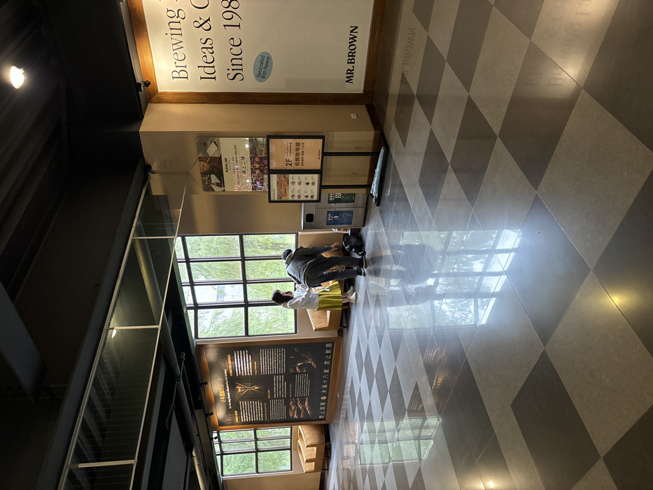 The image depicts an indoor area of the Kavalan Whisky Distillery Visitor Center, situated in Yuanshan, Yilan County, Taiwan. The room features a high, dark ceiling with visible infrastructure and recessed lighting. The floor is composed of large, glossy light and dark grey checkered tiles, reflecting the overhead lights and external view. On the left, a series of large, multi-paned windows provides a view of dense green foliage outside. Adjacent to these windows, two light-colored, possibly wicker or rattan, armchairs are positioned. A large dark brown informational display board, partially in Chinese, regarding "The Yi-Lan Hundred-Year-Old Distilling" is mounted on the left wall. In the mid-ground, two individuals are present. A female, dressed in a white long-sleeved top and a bright yellow skirt, stands facing to her right. Next to her, a male wearing a dark grey jacket and dark trousers is bent over, reaching towards a black backpack on the floor. This action occurs beside a silver recycling bin and another grey bin. A dark, collapsed umbrella lies horizontally on the floor in front of these bins. On the right wall, a large white sign with brown lettering displays "Brewing Ideas & Craft Since 1980" and the brand "MR. BROWN". Below this, a freestanding sign features "2F 伯朗咖啡館" (2F Mr. Brown Coffee Shop) with a menu, and a hanging poster above it displays the "KAVALAN" brand logo and imagery.