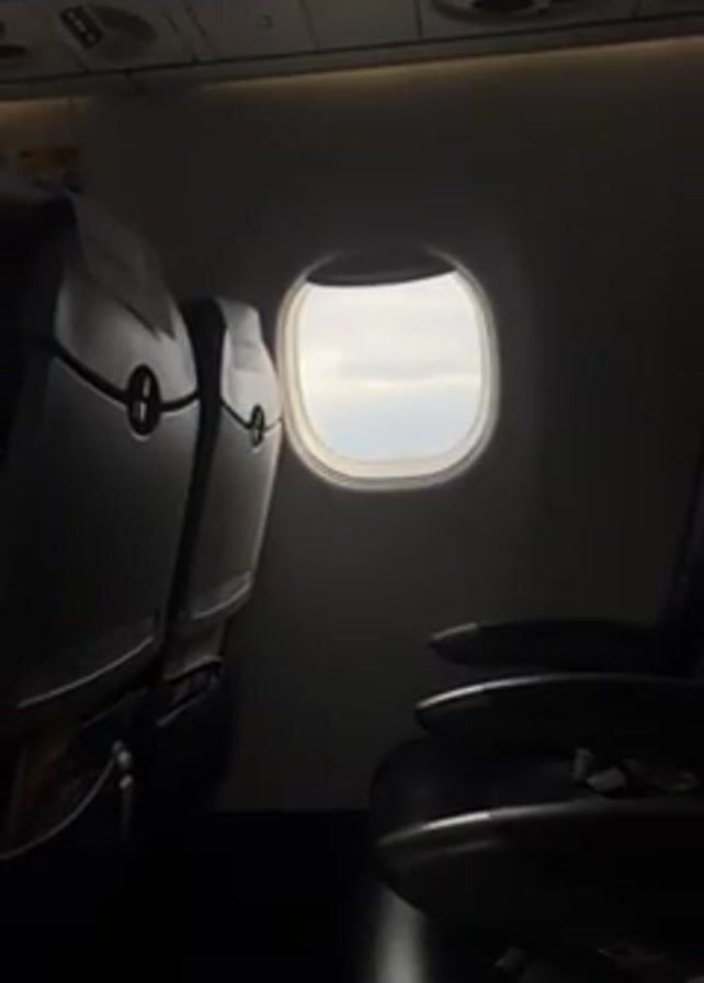 interior of an airplane cabin with a view from an airplane window. The interior is dark, with light coming in from the airplane window. You can see the sky and horizon through the window. The seats are black and grey. There is no person visible. The video appears to be static.
