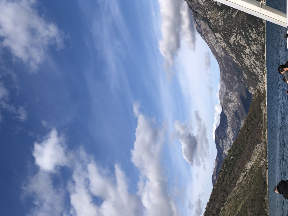 The scene depicts a wide vista of the Bay of Kotor, specifically near Lepetane, Montenegro, viewed from a boat. The sky occupies the upper two-thirds of the image, featuring a deep blue expanse dotted with scattered white and light grey cumulus and cirrus clouds. Below the sky, two prominent mountain ranges frame a body of dark blue water. The mountains exhibit steep, rocky slopes; the range on the left is partially covered with sparse brown and green vegetation, while the range on the right shows more exposed grey rock with patches of vegetation. A narrow strip of land with what appears to be a coastal road is visible at the base of the mountains along the water's edge, particularly on the left side. The water surface displays small ripples, indicating movement. In the immediate foreground, at the bottom of the image, the upper backs and heads of at least two individuals are partially visible, consistent with passengers aboard a vessel. One individual on the far left wears a dark hooded jacket. A white structural component of the boat extends vertically from the bottom right corner.