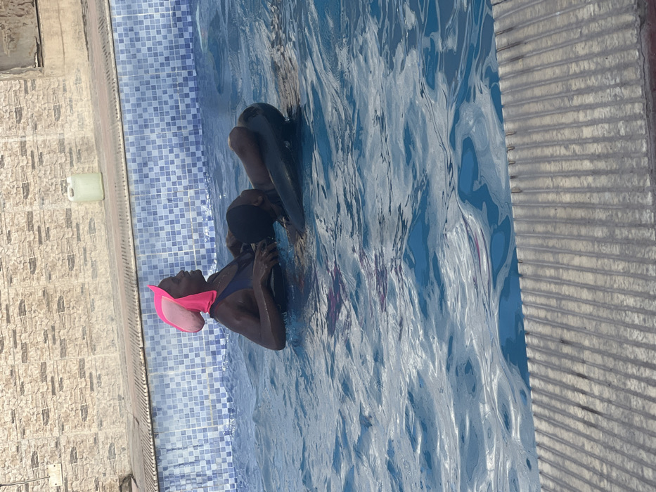 Two people are in a swimming pool. The pool is tiled with blue and white squares. One person is wearing a pink swim cap and is near the edge of the pool, facing the camera. The other person, wearing a black swim cap, is behind the first person and appears to be holding onto them. The water is clear with some ripples. A wall is visible to the left, and a grated surface is to the right of the pool.