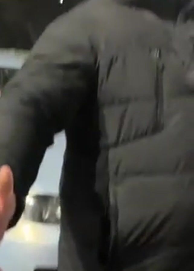 two young men standing outside at night. One of the men is looking at a phone, while the other is talking and looking directly at the camera. They are standing near a parked white car and a grassy area. The man who is speaking is wearing a black puffer jacket. The lighting is dim, suggesting it's dark outside.