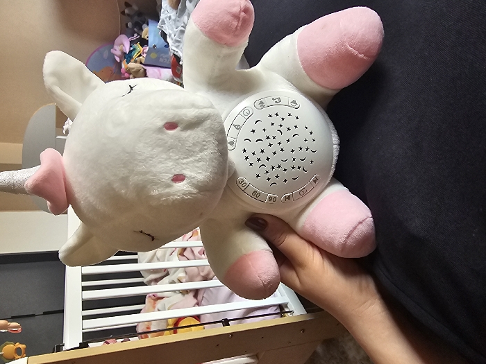 A white plush unicorn toy, featuring a pink snout, pink hooves, pink inner ears, embroidered closed eyes, and a silver-textured spiral horn with a soft pink base, is depicted in the foreground. Its abdomen houses a white circular plastic panel perforated with stars and crescent moons, alongside control symbols for power, music, and light, and numerical timer settings (30, 60, 90). A human hand, with short, dark nail polish, grasps the unicorn's left side, supporting it as it rests on a dark fabric surface. The background reveals a child's room. To the left, a light-colored wooden crib with white vertical slats contains pink and yellow bedding or soft toys, with a portion of a mobile visible above it. To the right, a surface is cluttered with various children's items, including a blue basket and assorted toys. The room is brightly illuminated. Location: Unknown, Unknown.
