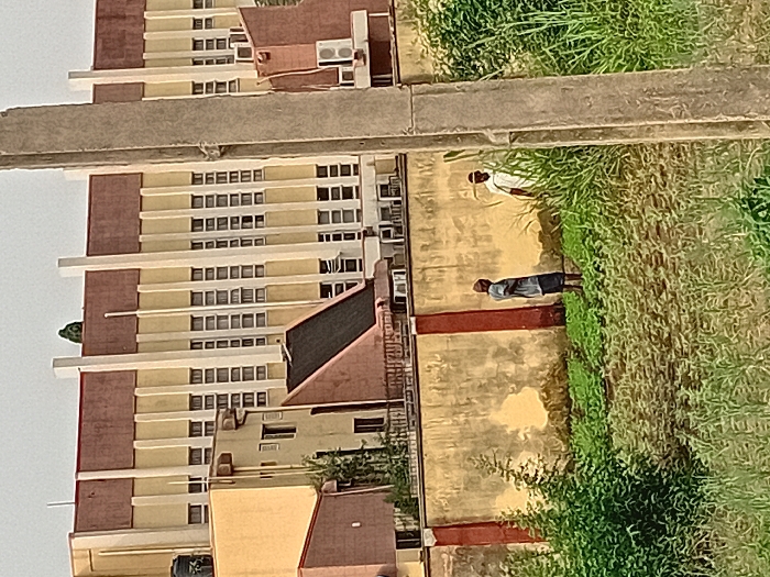 A high-angle shot depicts a multi-story building with beige and brown sections, facing a walkway. Two individuals are visible on the walkway, dressed in casual clothing. Lush green vegetation grows alongside the path, blurring the line between the built environment and nature. A concrete structure overlays the scene.