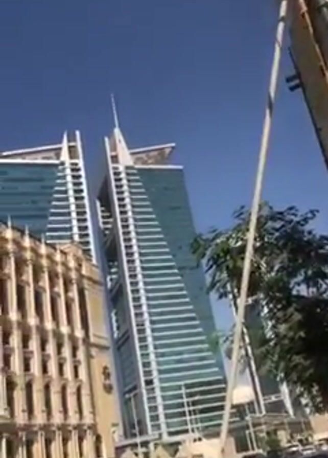 street scene with modern buildings under a clear blue sky. Two tall, glass-clad towers with pointed tops dominate the background. A more ornate, classical building is visible to the left. Several cars are parked along the street, and a few trees are interspersed. A pole is visible in the foreground. The camera appears to be moving slightly.