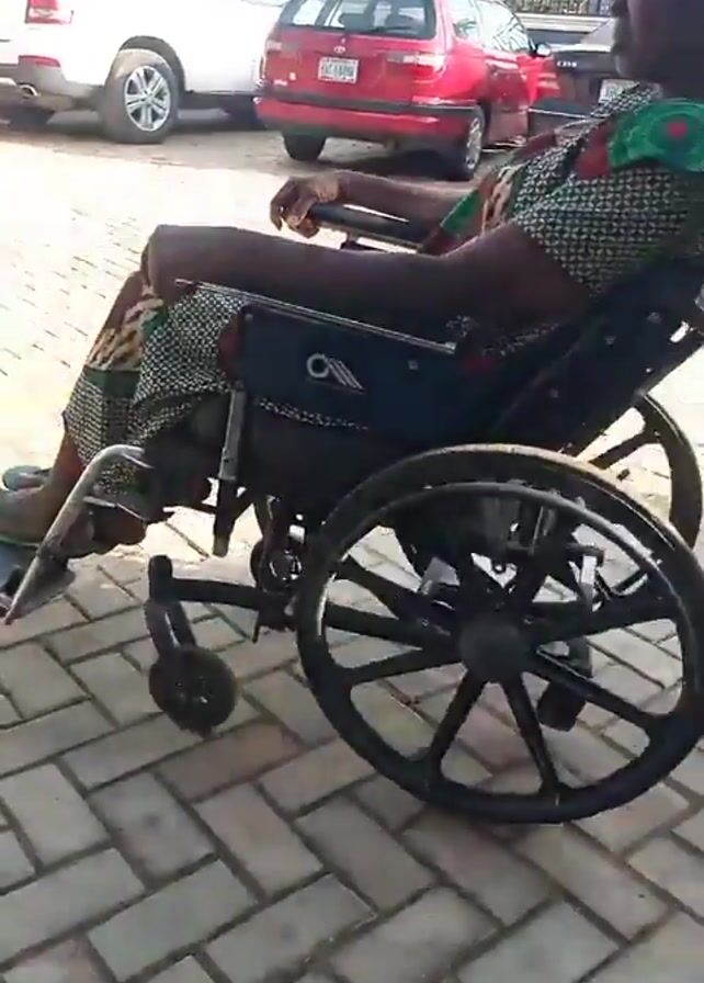 woman sitting in a wheelchair, being pushed by a man on a brick-paved area. The woman has dark hair pulled back in a bun and is wearing a patterned top. The man pushing the wheelchair is wearing a dark blue shirt and pants, with white and black Crocs. Behind them are several parked cars: a white SUV, a red station wagon, and a black sedan. The camera is positioned low and appears to be held by someone sitting. The shadow of a pole is visible on the brick pavement.