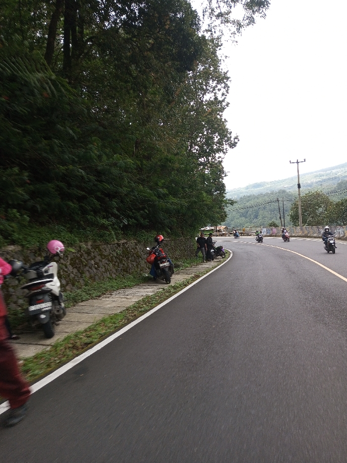 The image depicts a roadside scene in the city of Phoxay, Laos, under an overcast sky. A two-lane asphalt road, marked with a solid white line on its left edge and a faded yellow center line, curves gently to the right towards the distant horizon. On the left side of the road, a concrete sidewalk runs parallel to a stone retention wall, which supports a densely vegetated, steep hillside covered in various green foliage and trees. In the immediate foreground on the left, the lower torso and legs of a person wearing reddish-brown pants and dark shoes are visible, walking forward. Adjacent to this person, a light-colored scooter with a pink helmet resting on its seat is parked on the sidewalk, facing away from the viewer. Further down the sidewalk, a dark-colored motorcycle with an orange helmet on its seat is parked, leaning against the stone wall. Behind this motorcycle, two adult males are standing and interacting near a third, dark-colored scooter or motorcycle also parked on the sidewalk. One male is dressed in a dark shirt and pants, while the other wears similar attire; they appear to be conversing. On the paved road, multiple motorcycles with helmeted riders are in motion, traveling away from the viewer along the curve of the road. The closest moving motorcycle is dark-colored. Beyond it, a group of three to four more motorcycles follow. In the mid-ground, a utility pole with electrical lines stands on the right side of the road. The background reveals rolling hills or mountains covered in lush vegetation under a bright, diffused sky.