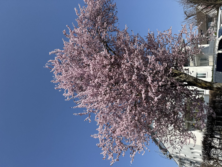 The image displays a large deciduous tree in full pink blossom, dominating the central and upper portions of the frame, set against a clear, cloudless blue sky. The tree's trunk is visible in the lower center. In the background, to the left and center, a multi-story residential building with a light-colored façade is present, featuring balconies with metal railings and an external metal staircase on its left side. The upper sections of at least two white vans or cars are partially visible in the lower midground, positioned behind low, dark hedges and the base of the flowering tree. Additional bare trees and shrubs are located on the far right. The scene is brightly illuminated by natural sunlight, indicating a clear day in an urban or suburban environment within the city of Bühl, Germany. No individuals or specific actions are discernible.