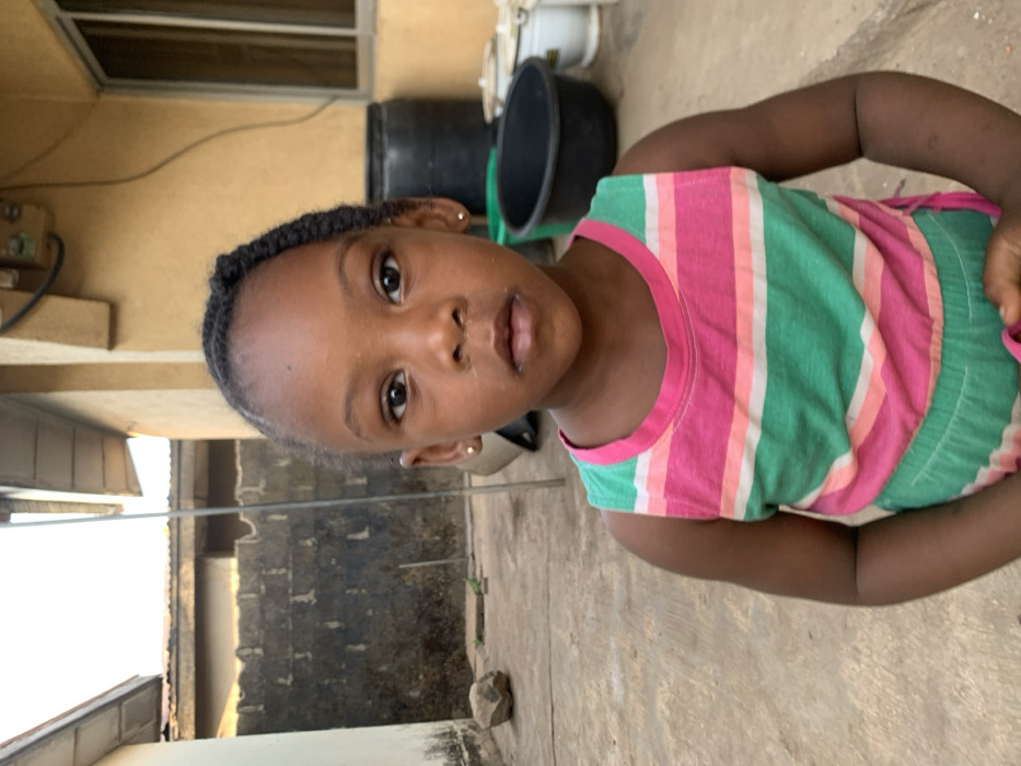 A young Black girl with braided hair is depicted from the waist up, angled to the right. She wears a striped pink, white, and green shirt. The background features a mix of indoor and outdoor elements. There's a section of wall with a window, various containers, and a glimpse of another building. The foreground is dominated by a concrete surface.