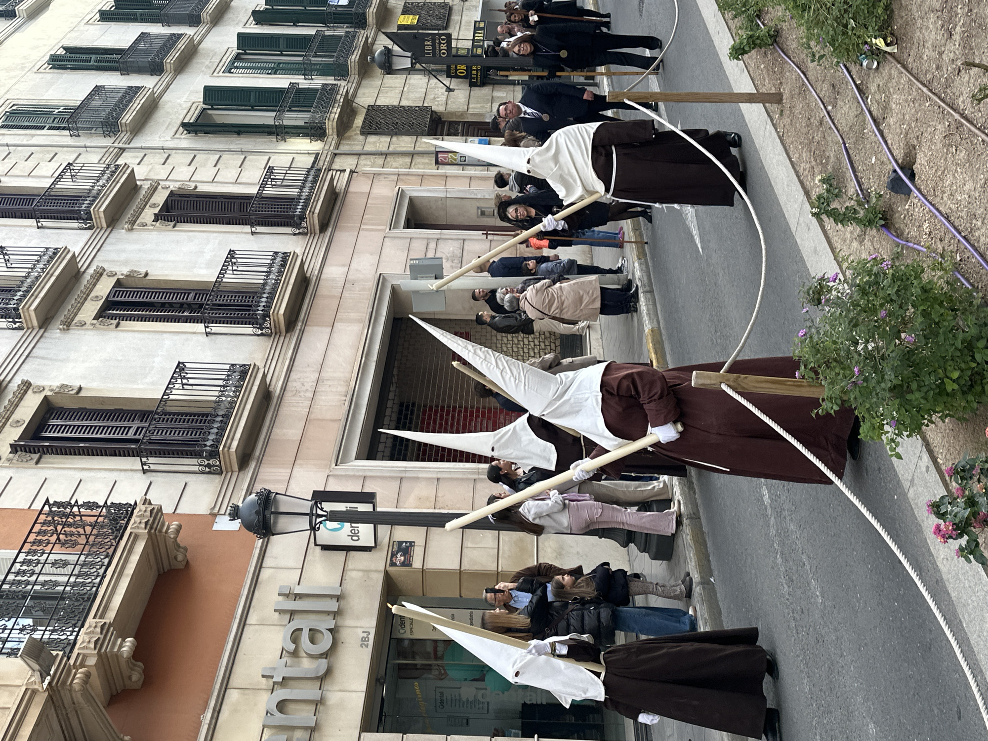procession of penitents in Alicante, Spain, likely during Holy Week. They are wearing traditional "capirotes" (pointed hoods) and robes. They are walking along a city street, with onlookers watching from the sidewalks. The buildings lining the street have ornate wrought iron balconies and closed shutters. Signage indicates commercial establishments, including dental services. The "capriotes" hold rods and are walking in order. Some of the onlookers are photographing or filming the parade. A white rope acts as a barricade between the penitents and the observers.