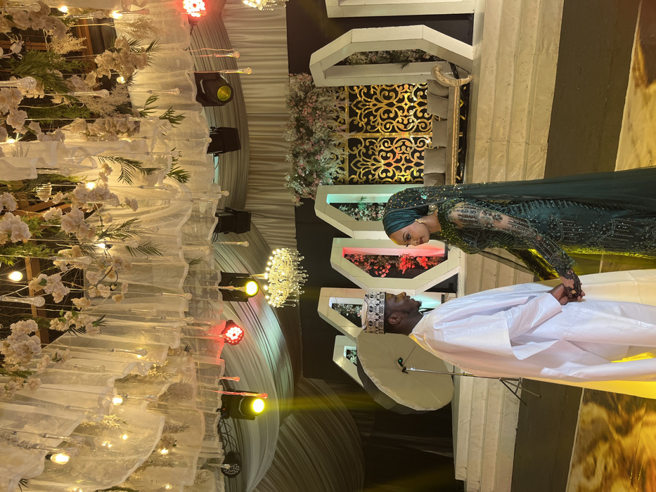 A wedding ceremony is underway with a bride and groom center frame. The bride, in a green, heavily embellished dress and hijab, gazes at the groom, who is dressed in traditional white attire. They hold hands tenderly. The backdrop features elegant decorations including white fabric, floral arrangements, and ornate gold latticework. Lighting fixtures and a chandelier contribute to the ambience, casting a warm glow on the scene. The composition captures the intimacy and celebratory atmosphere of the event.