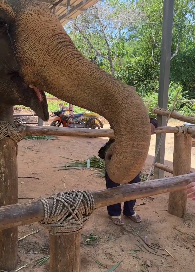 Here's a detailed description of the video: The video shows an elephant behind a wooden fence under a covered structure. The elephant uses its trunk to grab food being offered by a person standing outside the fence. The elephant curls its trunk inward toward its mouth to eat. A man in a green shirt and hat leans against the fence in the background, watching. The ground is dirt, and there is some scattered vegetation. A motorcycle is visible in the background beyond the fence.