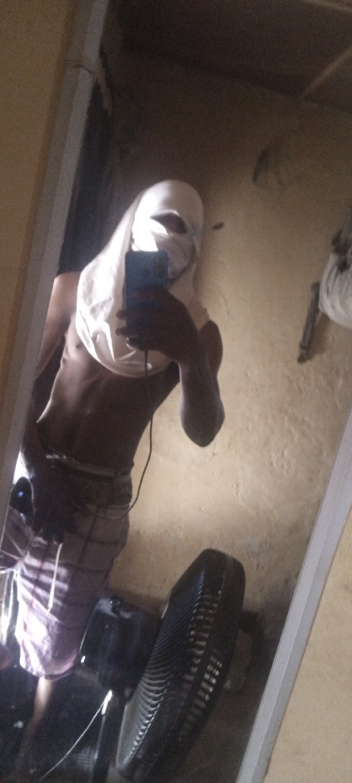 An individual is depicted in a mirror selfie taken indoors within Sabon Tasha, Nigeria. The subject, appearing male with dark skin, stands topless, revealing a muscular torso, and wears plaid shorts. Their face is obscured by a white fabric, possibly a t-shirt, pulled over the head and fashioned into a mask with eye openings. The individual holds a dark-colored smartphone with an illuminated screen in their right hand, capturing the reflection. A black cord, likely from the phone, hangs downwards. The background, reflected in the mirror, shows a light brown or tan wall with visible texture and imperfections. A black standing fan is positioned in the lower right foreground, with another dark, indistinct object partially visible to its left. A white fabric item is draped over an unseen object in the upper right background. The scene is illuminated by ambient light and the phone's screen.