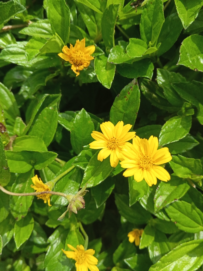 The scene is located in ឃុំ ផាត់សណ្ដាយ, Cambodia. The image presents a close-up, top-down perspective of thriving plant foliage. Dominant subjects are multiple small, bright yellow flowers interspersed among dense green leaves. Two prominent yellow flowers, each displaying clear ray florets and a visible central disc, are positioned in the mid-frame. Additional yellow flowers, some partially obscured or in varying stages of bloom, are visible in the upper-left, bottom-center, and lower-right areas. The surrounding foliage consists of numerous medium-green, oval to elliptical leaves with serrated margins, some exhibiting minor brown discoloration or blemishes. The environment appears to be an outdoor setting under natural light, casting subtle shadows and highlighting the plant surfaces. No people, animals, or artificial objects are present, and no actions or interactions are depicted.