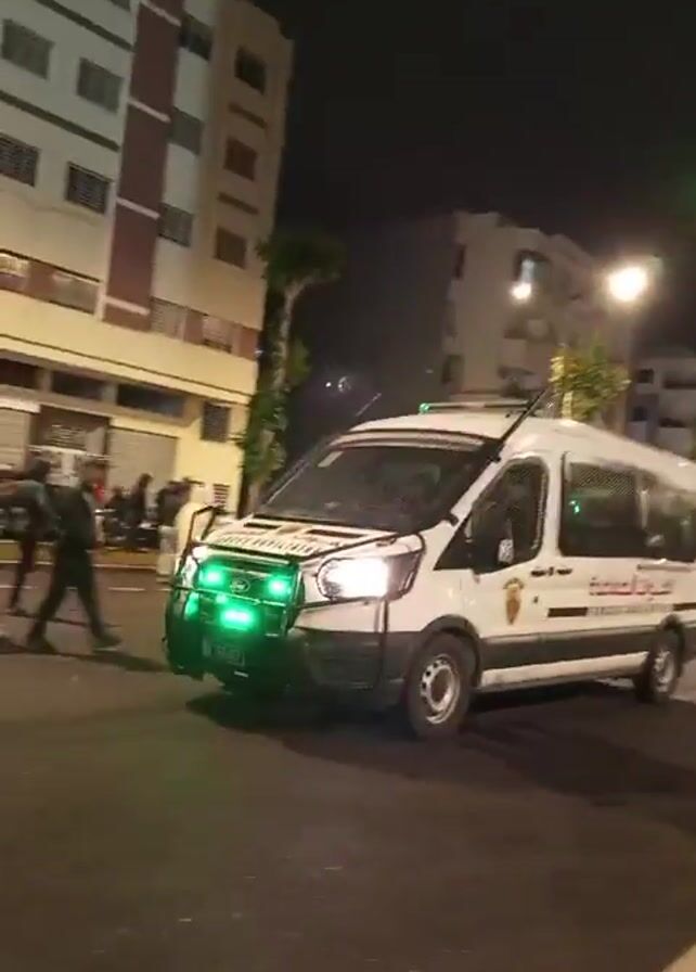 At night, a white van with green lights on top drives slowly. The van is labeled "Forces Auxiliaires" in Arabic and English. People are standing around the van, some filming it with their phones. The van has a black grate over the windows. The buildings in the background are lit up.